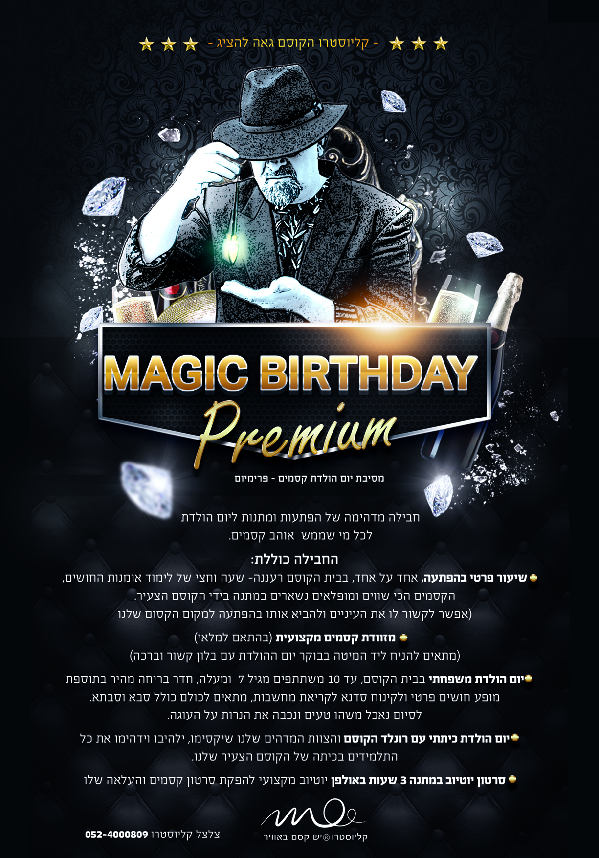 שיעור פרטי אחד על אחד עם הקוסם הגדול, במרתף הקוסם, אפשר לתאם הפתעה מלאה, גיבור היומהולדת למשל מכוסה עיניים מגיע בהפתעה גמורה למרתף הקוסם. במהלך השיעור לומדים ומקבלים 6-10 קסמים הכי מדהימים שיש, מתנה מדהימה.